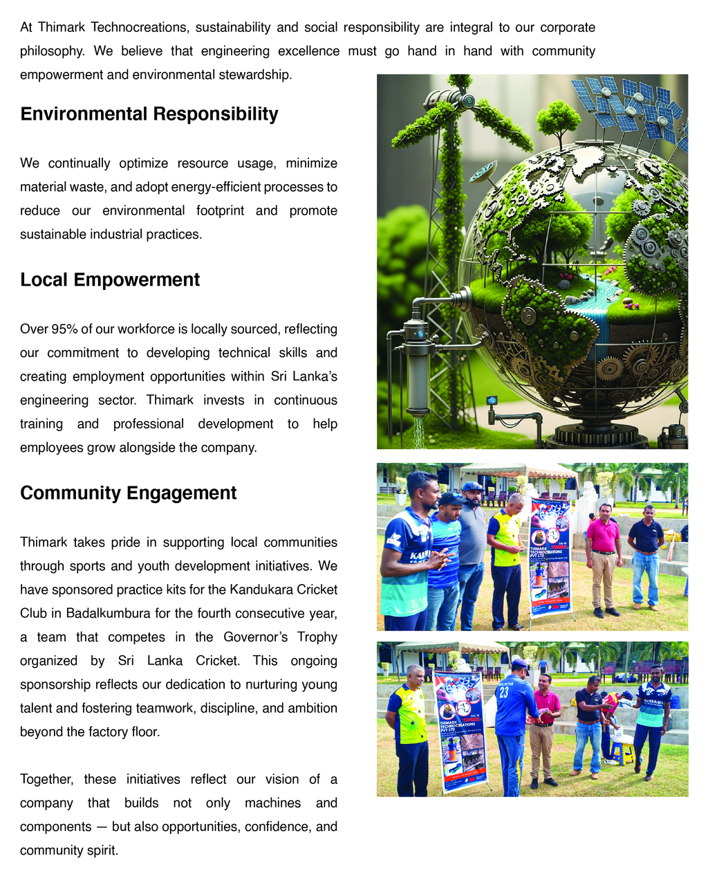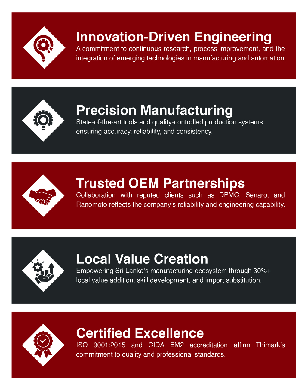 Driven by engineering excellence, commitment to customer satisfaction, and a vision for industrial advancement, Thimark Technocreations (Pvt) Ltd is moving forward with confidence, shaping the future of engineering and manufacturing in Sri Lanka and beyond.